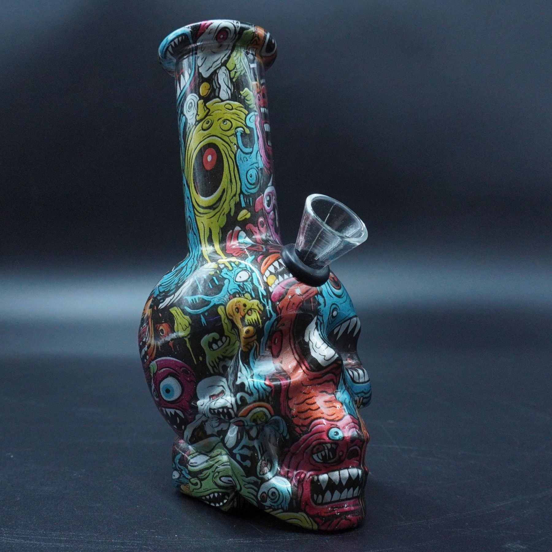 Stand out from the crowd with the 3D Skull Base Water Pipe! This isn't just a pipe; it's a work of art, featuring an intricately molded skull-shaped base adorned with a vivid, full-wrap graphic of [briefly describe the graphic, e.g., "colorful cartoon monsters and grinning faces"].