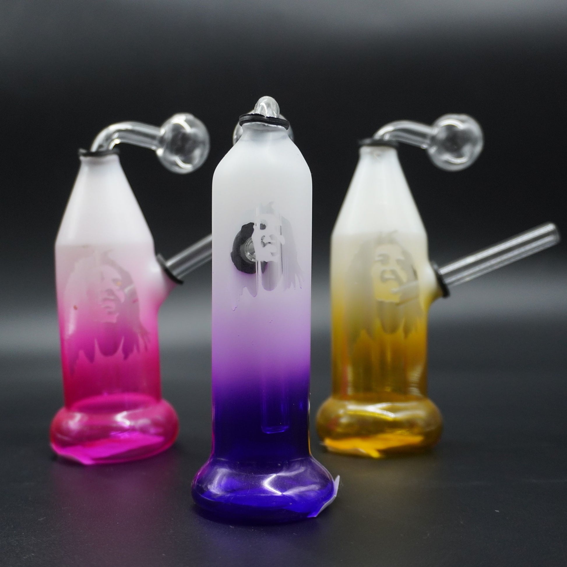 Channel legendary energy with these captivating mini water pipes, featuring an iconic relief image that pays homage to a timeless musical legend. Each piece boasts a stunning frosted glass body that transitions into a vibrant, translucent color at the base, creating a beautiful gradient effect that's truly eye-catching.