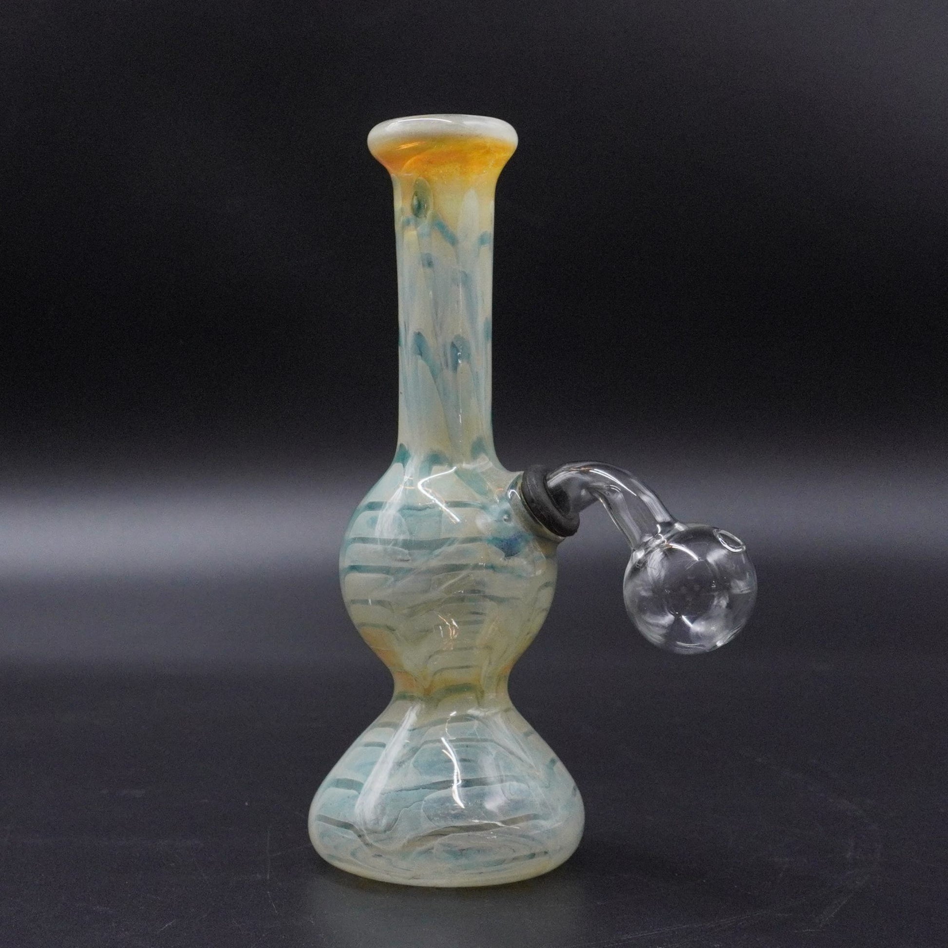 Embrace the serene beauty of the sea with the captivating "Ocean Mist" Fumed Glass Oil Burner! This enchanting mini rig features mesmerizing fumed glass with an iridescent, "sea glass" effect. Watch as subtle hues of blues, whites, and yellows shimmer and shift under different lighting, creating a tranquil visual experience reminiscent of ocean waves and arctic ice.